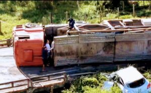 Um grave acidente foi registrado na tarde de quarta-feira (06) na BR-101, no km 521, entre os municípios de Buerarema e Itabuna, no sul da Bahia. Uma carreta cegonha, que transportava dez veículos, tombou sobre uma ponte e bloqueou parcialmente a rodovia, provocando um extenso congestionamento e colocando em risco a segurança dos motoristas que trafegavam pela região.