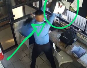 No vídeo, é possível ver o momento em que ele pega o capacete sobre a mesa e desfere o golpe, enquanto a mulher tenta se proteger com as mãos. Após a agressão, o homem recolhe seus pertences e, antes de sair da portaria, ainda desfere um tapa na vítima.